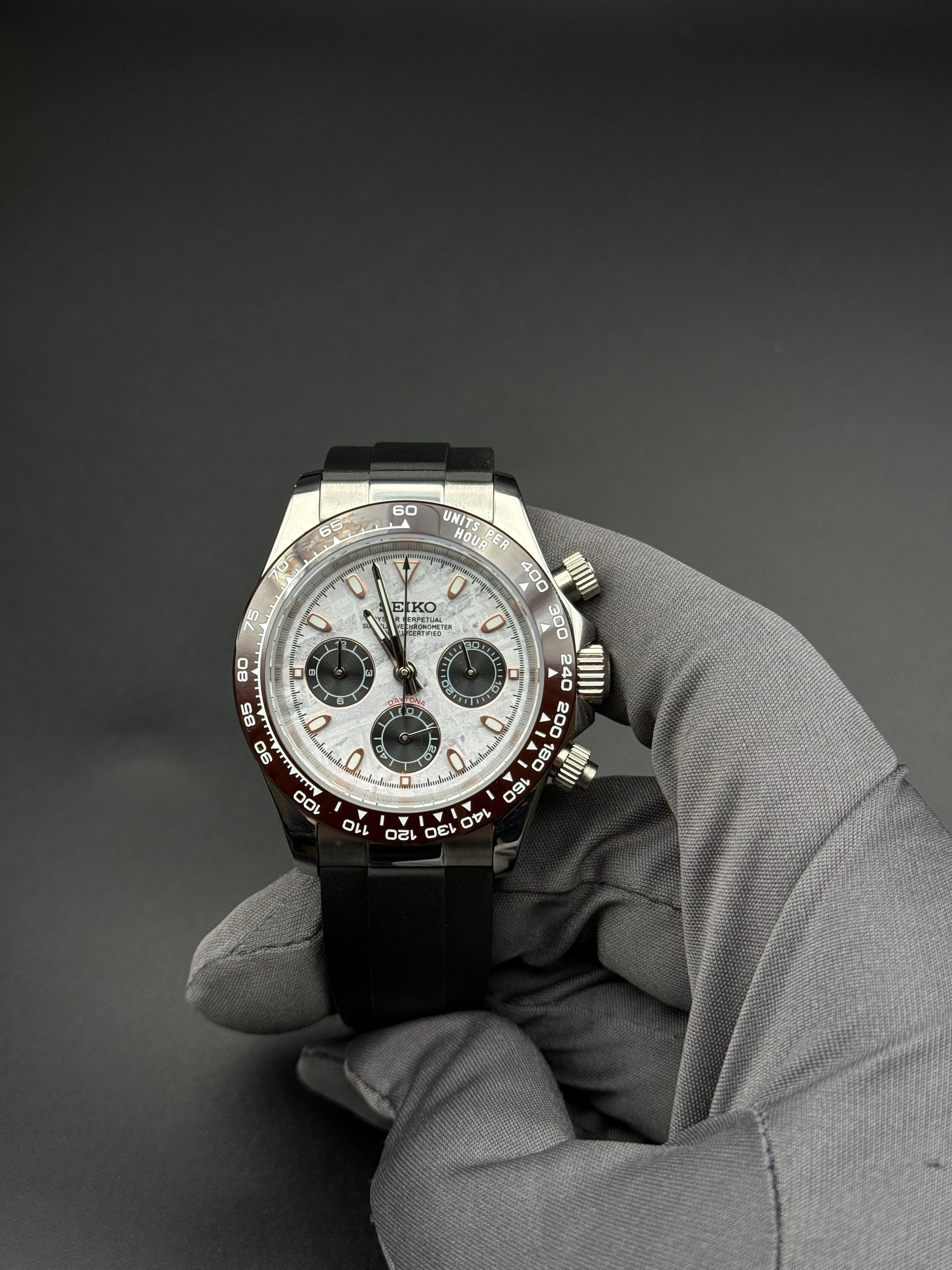 The ceramic bezel of this Seikomod watch complements the meteorite-style dial, creating a visual spectacle that is matched only by its precise internal mechanism. Every detail of this Seiko Mod watch is carefully considered to give you an unparalleled watch experience.