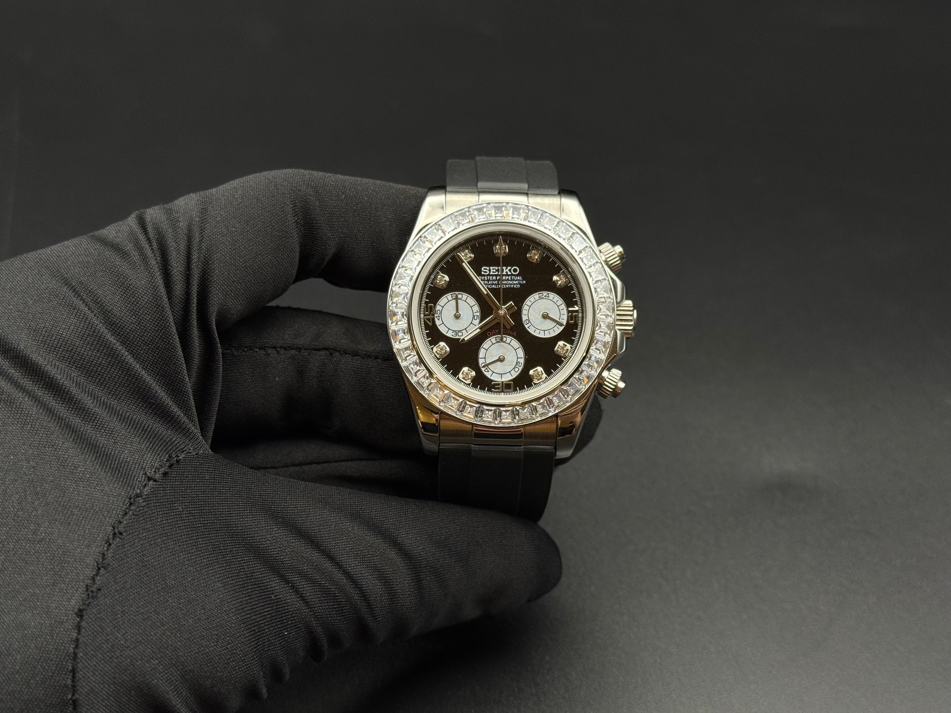 La lunette en diamants de cette montre Seikomod complète le cadran style diamants, créant un spectacle visuel qui n'est égalé que par son mécanisme interne précis. Chaque détail de cette montre Seiko Mod est soigneusement pensé pour vous offrir une expérience de montre sans égale.